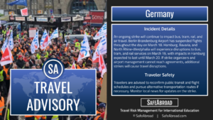 Transportation workers will strike in several cities across Germany from March 18 until March 20; anticipate transportation disruptions.