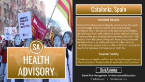 Doctors will strike and protest in Catalonia, Spain on March 19-20; expect disruptions to public and private healthcare.