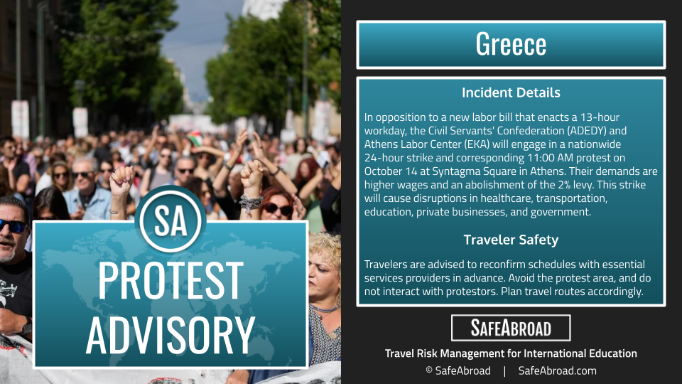 In opposition to a new labor bill that enacts a 13-hour workday, the Civil Servants’ Confederation (ADEDY) and Athens Labor Center (EKA) will engage in a nationwide 24-hour strike and corresponding 11:00 AM protest on October 14 at Syntagma Square in Athens. Their demands are higher wages and an abolishment of the 2% levy. This strike will cause disruptions in healthcare, transportation, education, private businesses, and government.