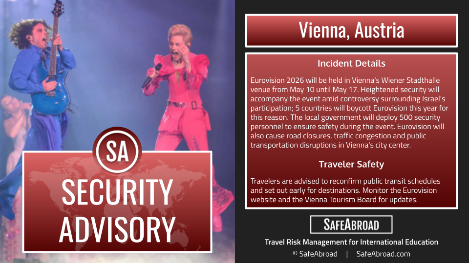 Travelers are advised to reconfirm public transit schedules and set out early for destinations. Monitor the Eurovision website and the Vienna Tourism Board for updates.