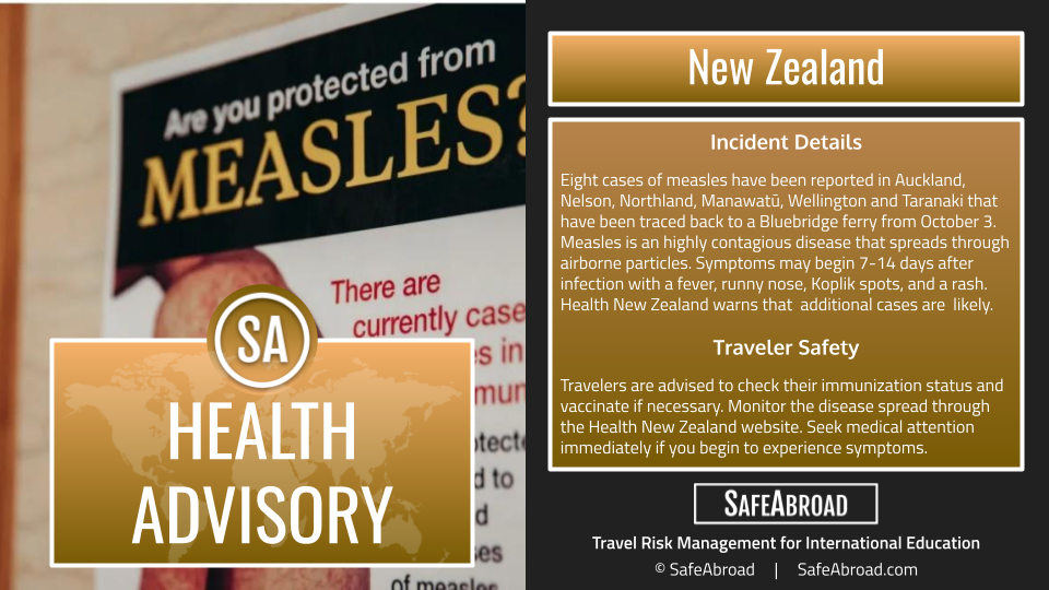 Eight cases of measles have been reported in Auckland, Nelson, Northland, Manawatū, Wellington and Taranaki that have been traced back to a Bluebridge ferry from October 3. Measles is an highly contagious disease that spreads through airborne particles. Symptoms may begin 7-14 days after infection with a fever, runny nose, Koplik spots, and a rash. Health New Zealand warns that additional cases are likely.