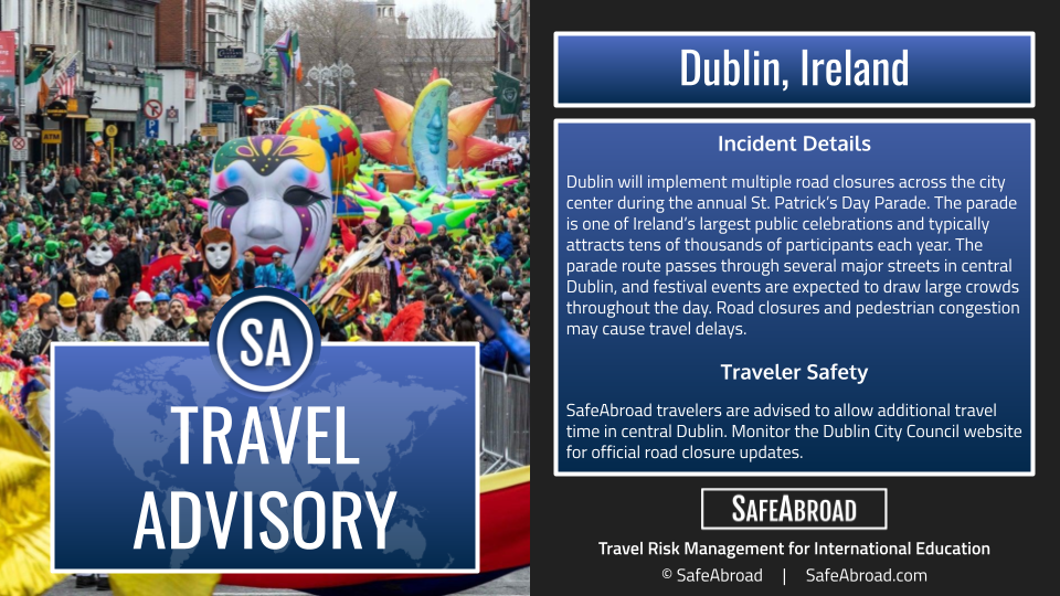 SafeAbroad travelers are advised to allow additional travel time in central Dublin. Monitor the Dublin City Council website for official road closure updates.