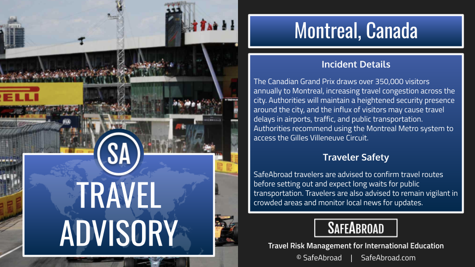 The Canadian Grand Prix draws over 350,000 visitors annually to Montreal, increasing travel congestion across the city. Authorities will maintain a heightened security presence around the city, and the influx of visitors may cause travel delays in airports, traffic, and public transportation. Authorities recommend using the Montreal Metro system to access the Gilles Villeneuve Circuit.