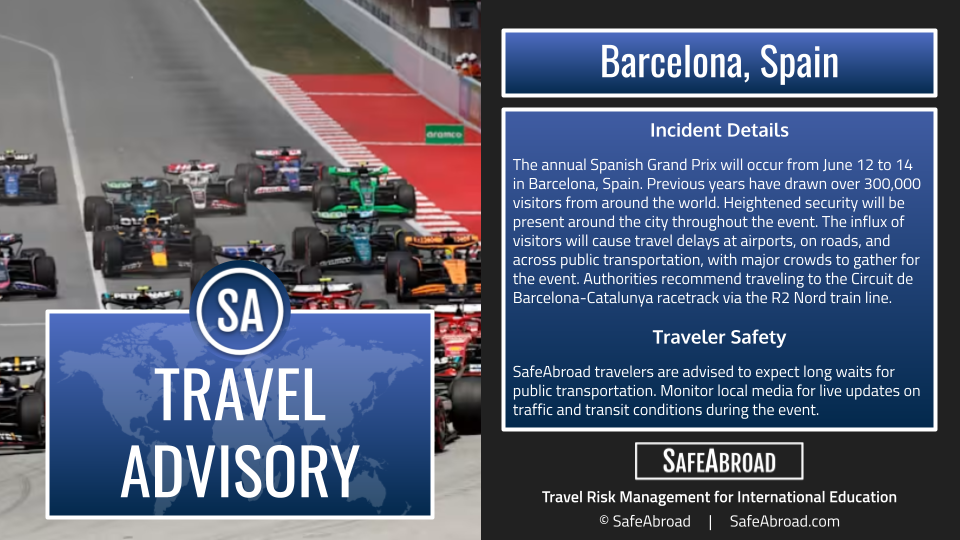 The annual Spanish Grand Prix will occur from June 12 to 14 in Barcelona, Spain. Previous years have drawn over 300,000 visitors from around the world. Heightened security will be present around the city throughout the event. The influx of visitors will cause travel delays at airports, on roads, and across public transportation, with major crowds to gather for the event. Authorities recommend traveling to the Circuit de Barcelona-Catalunya racetrack via the R2 Nord train line.
