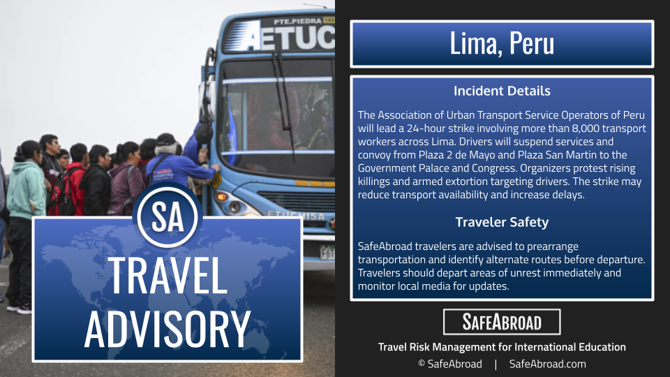 The Association of Urban Transport Service Operators of Peru will lead a 24-hour strike involving more than 8,000 transport workers across Lima. Drivers will suspend services and convoy from Plaza 2 de Mayo and Plaza San Martin to the Government Palace and Congress. Organizers protest rising killings and armed extortion targeting drivers. The strike may reduce transport availability and increase delays.