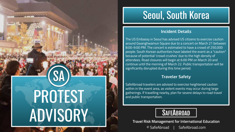 The US Embassy in Seoul has advised US citizens to exercise caution around Gwanghwamun Square due to a concert on March 21 between 8:00-9:00 PM. The concert is estimated to have a crowd of 250,000 people. South Korean authorities have labeled the event as a “caution” because of potential ‘crowd crushes’ due to the high density of attendees. Road closures will begin at 6:00 PM on March 20 and continue until the morning of March 22. Public transportation will be significantly disrupted during this time period.