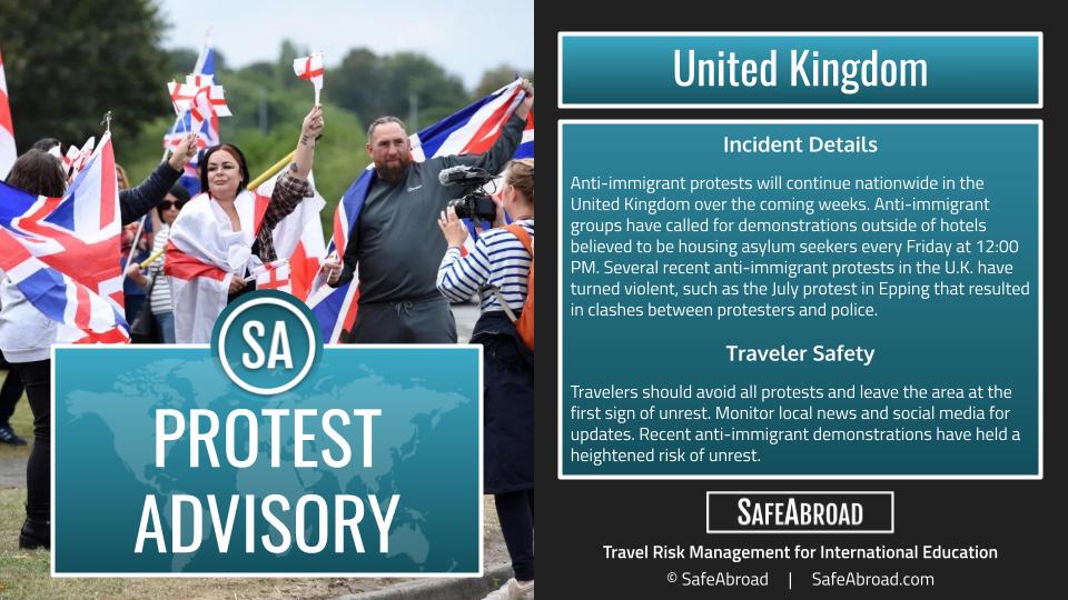 Incident Details Anti-immigrant protests will continue nationwide in the United Kingdom over the coming weeks. Anti-immigrant groups have called for demonstrations outside of hotels believed to be housing asylum seekers …