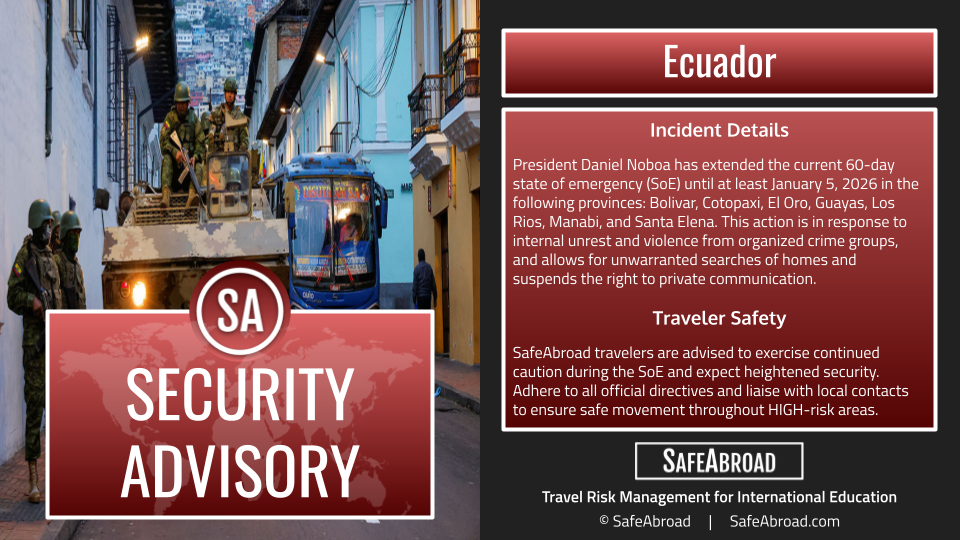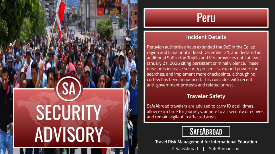 Peruvian authorities have extended the SoE in the Callao region and Lima until at least December 21, and declared an additional SoE in the Trujillo and Viru provinces until at least January 21, 2026 citing persistent criminal violence. These measures increase security presences, expand powers for searches, and implement more checkpoints, although no curfew has been announced. This coincides with recent anti-government protests and related unrest.