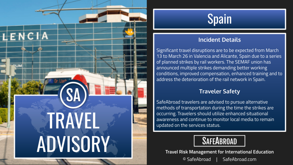 Significant travel disruptions are to be expected from March 13 to March 26 in Valencia and Alicante, Spain due to a series of planned strikes by rail workers. The SEMAF union has announced multiple strikes demanding better working conditions, improved compensation, enhanced training and to address the deterioration of the rail network in Spain.